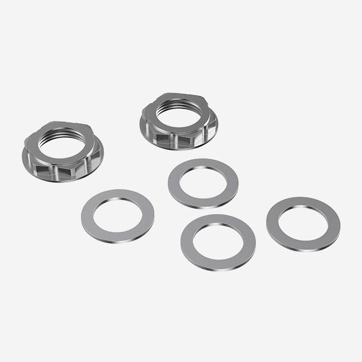 Set of 2 M16 hex nuts and 4 washers for the installation of the bePRO pedal on the crank arm.